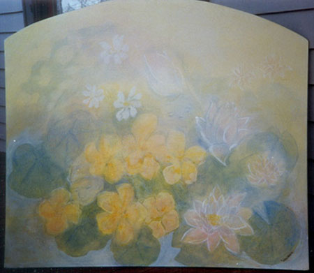 For wall murals and also for the boards, I use the Lazure technique - a wall treatment of layers of color, like clouds. The process is used in Europe and increasingly in the USA. The result can be a light filled space of moving color or pulled together into images.
